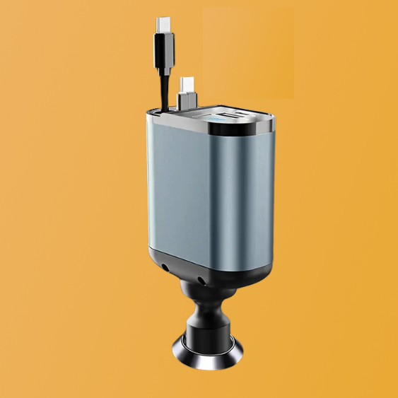 A high-speed 120W universal car charger with a retractable USB cable, male-to-female connector, and broad device compatibility. No battery required for seamless charging on the go.
